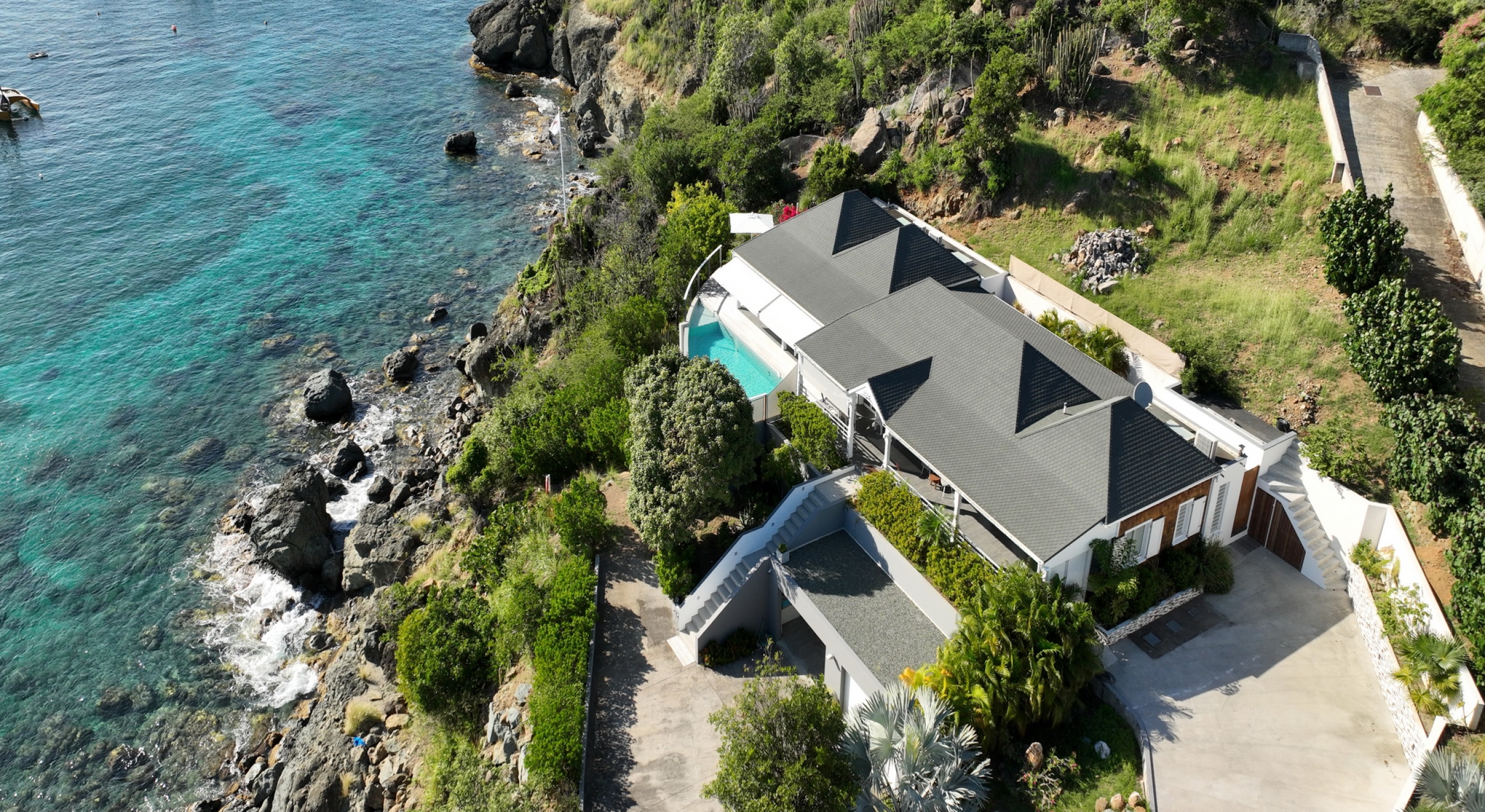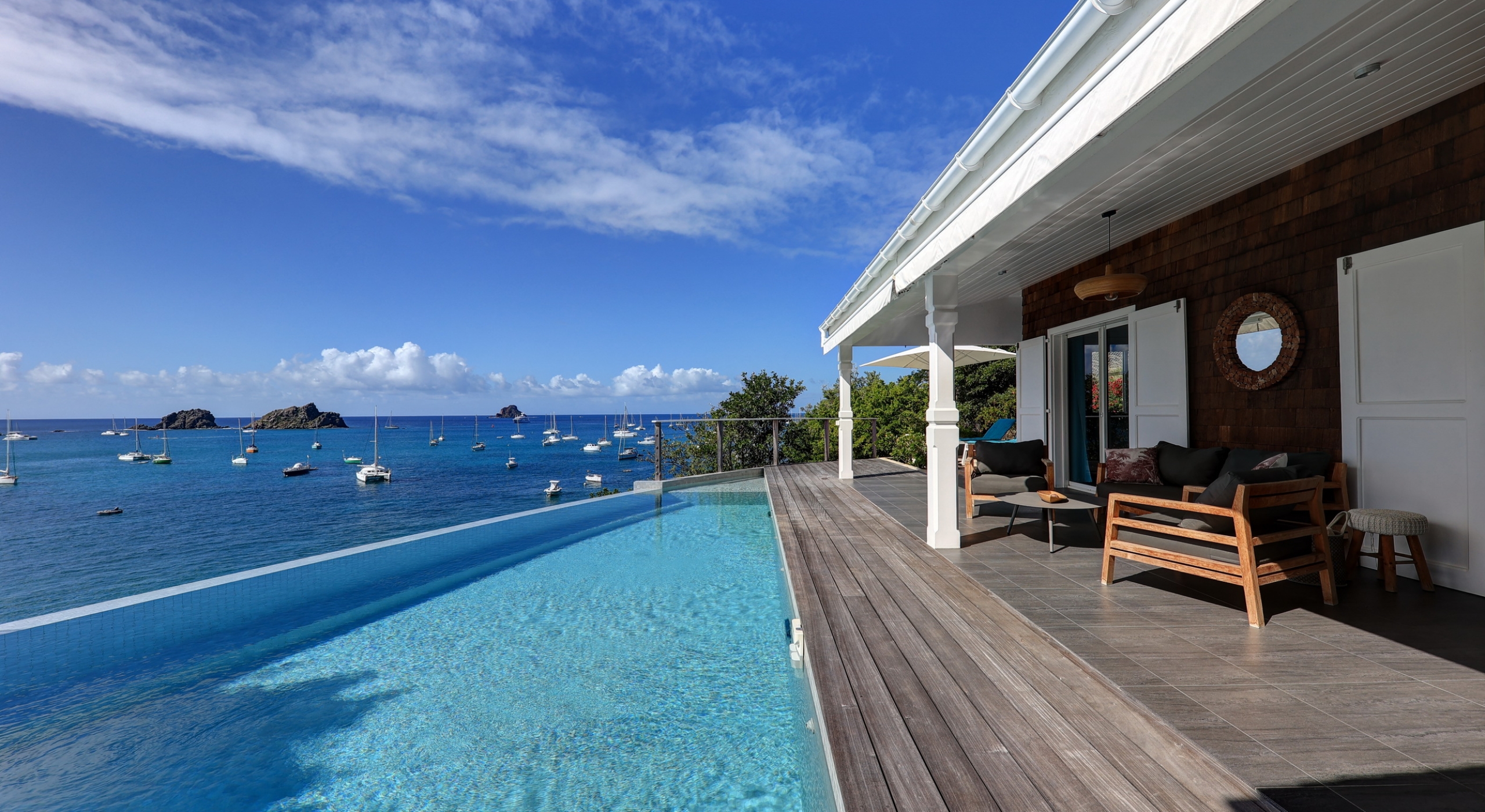 Villa Pleasure lives up to its name by offering a wonderful location along the western coast of St. Barts, and just west of Gustavia and its appealing harbor. Close to the coveted St. Jean area of the island, the three-bedroom villa is an expansive and amenities-rich spot from which to enjoy an unforgettable island getaway. While the sea is just steps below, many visitors find that the pool terrace is an irresistible attraction. Flanked along one edge by a wooden deck, it is a gently bowed and curved shape that includes a wading pool as well as a plunge area.