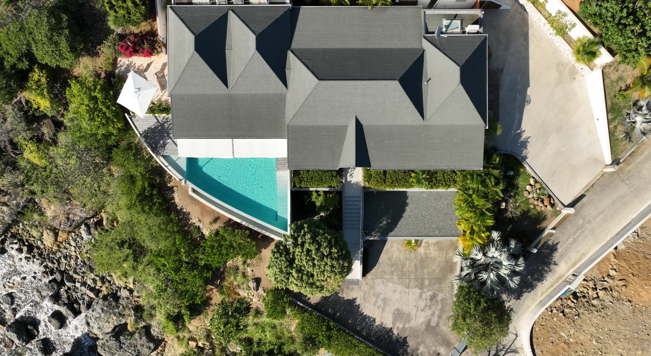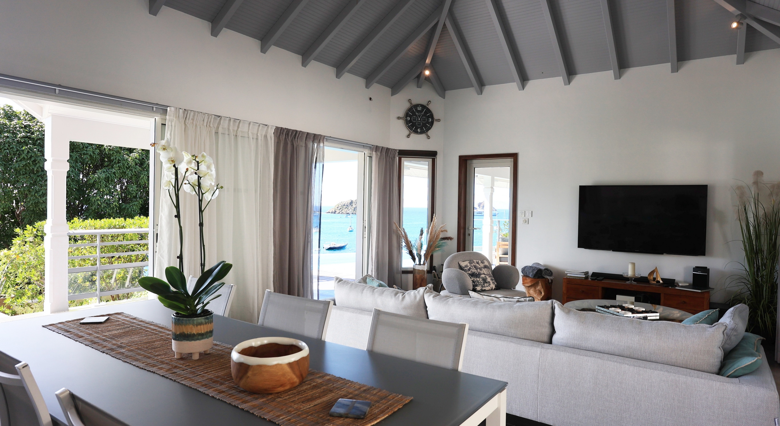 Spend hours gazing out at the sunsets from the cooling waters or from the comforts of the open and covered terrace areas. There are al fresco lounging areas furnished like interior living rooms, and even al fresco outdoor dining spaces. The exterior spaces are found on both sides of the villa, ensuring that sea breezes are constantly passing through the beautifully designed rooms. There is a central great room that incorporates classic elements of design, including high ceilings, stone floors and a neutral palette that really captures the light.