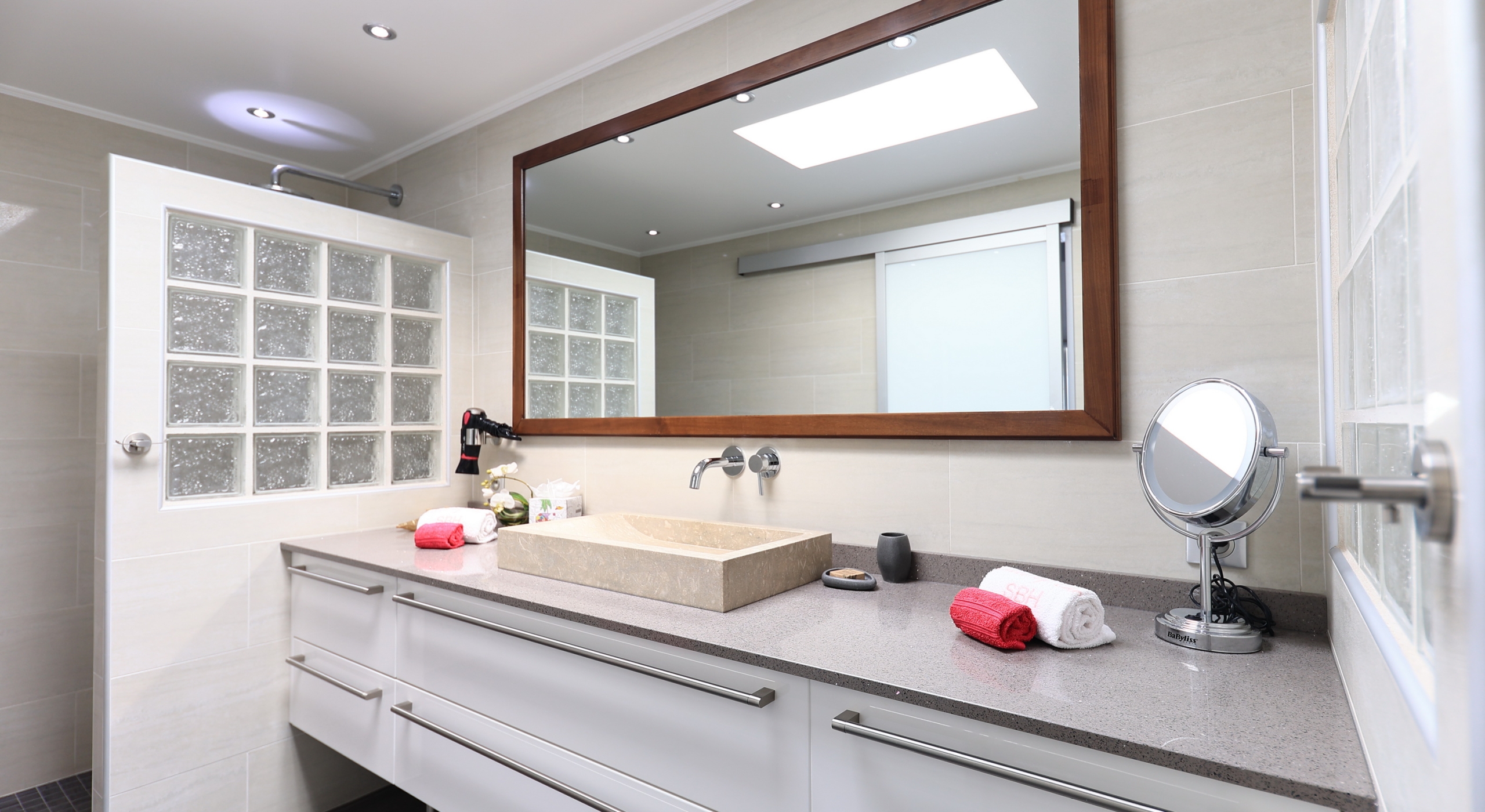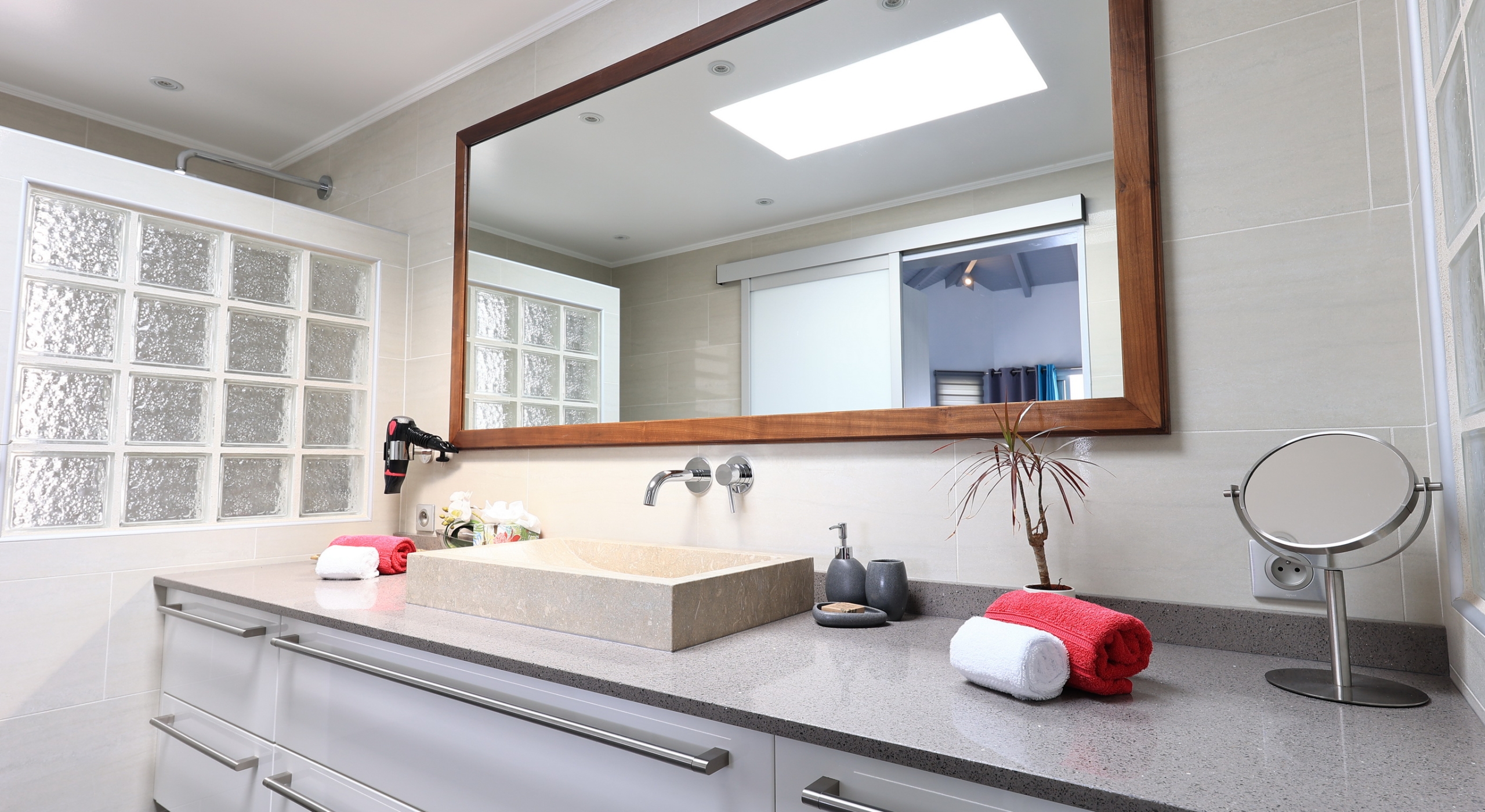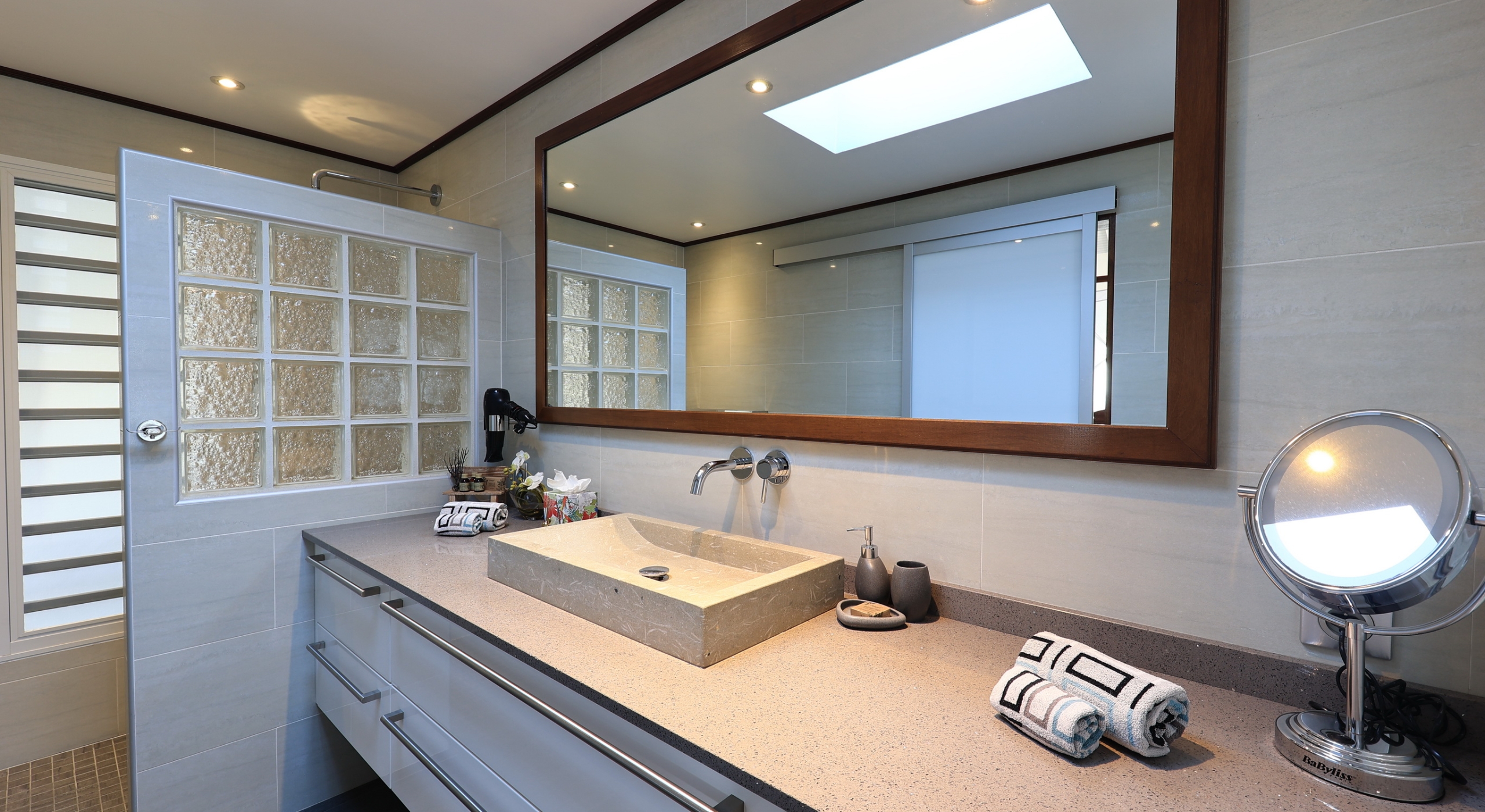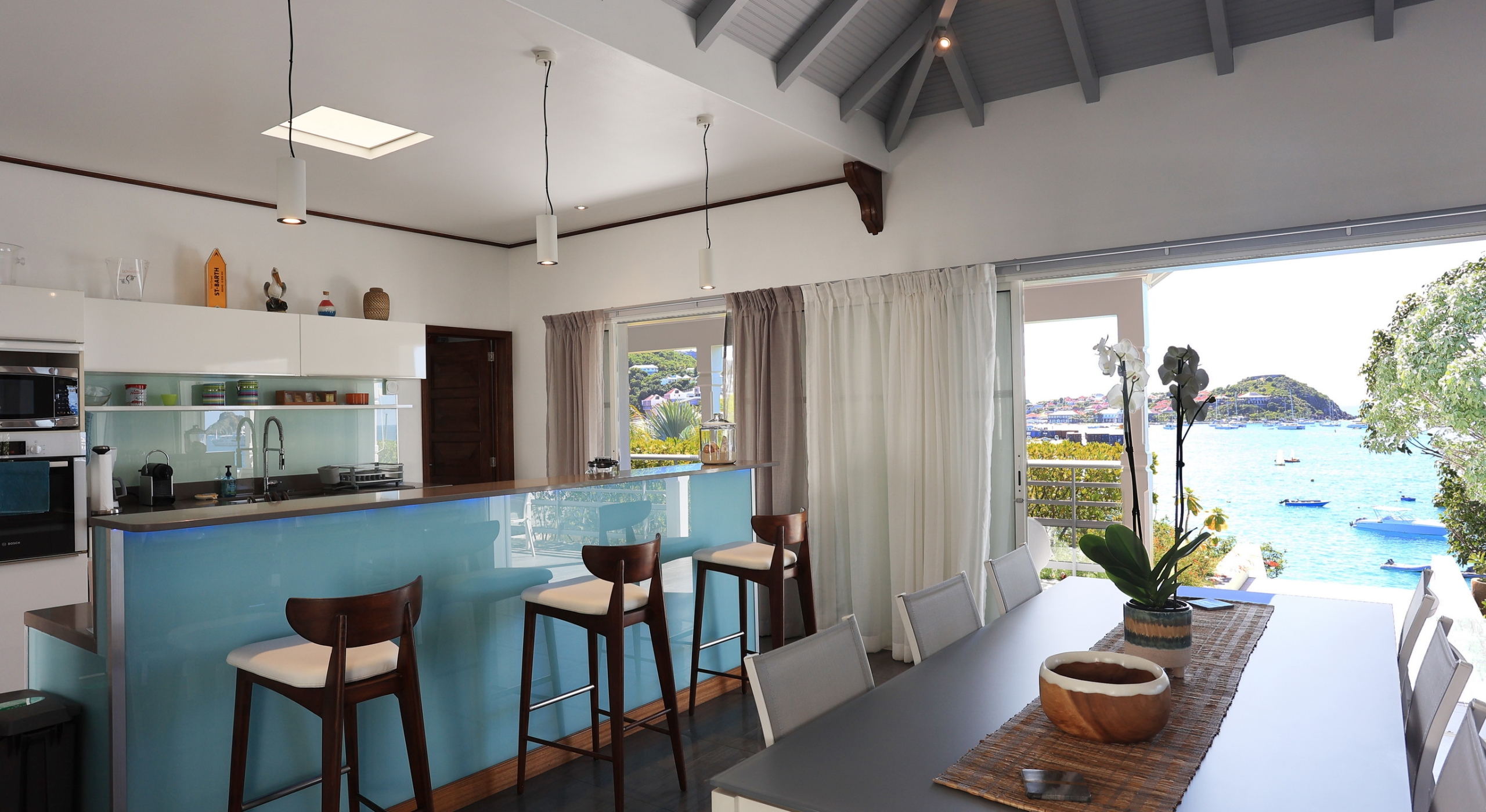 There is a living room, TV lounge, dining area, and a large and well-furnished kitchen that is in a galley style and which opens into the great room as well as placing the busy cook just steps from the terrace and the sea views.