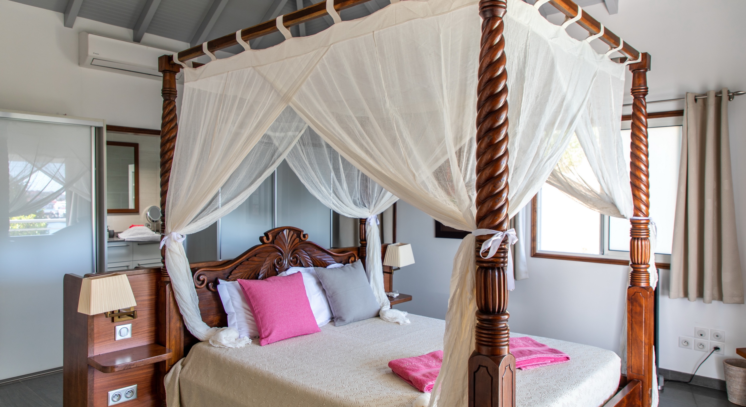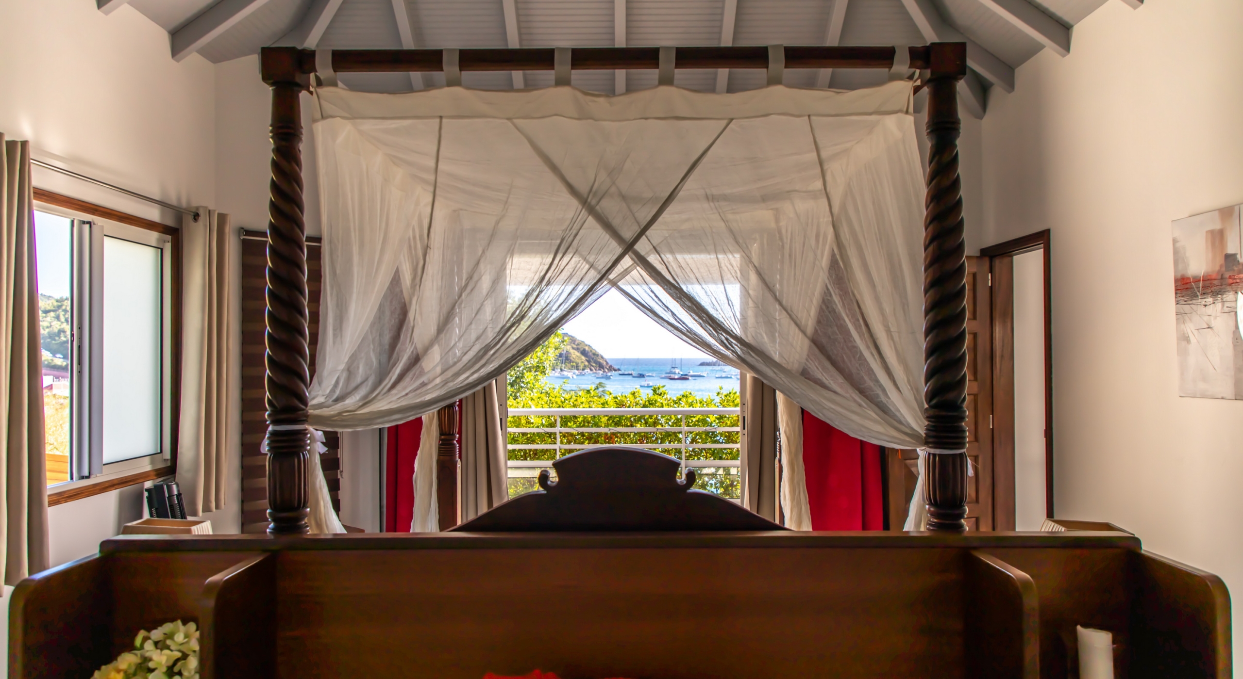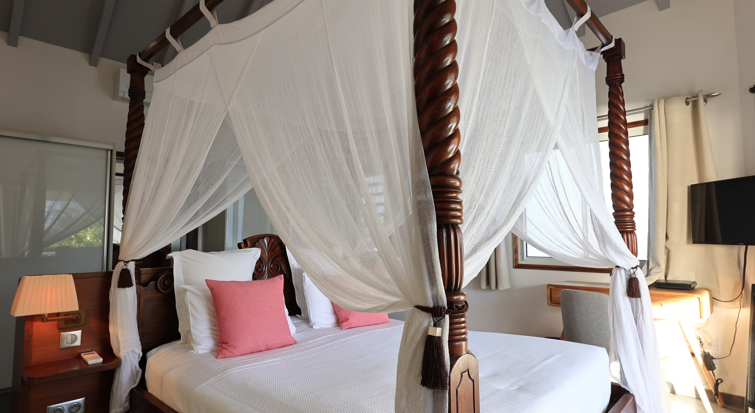 Bedroom 3: Bedroom with a queen-size four-poster bed with mosquito net, A/C, safe, ocean view and en-suite bathroom with shower, vanity and wc. 2 guests maximum.